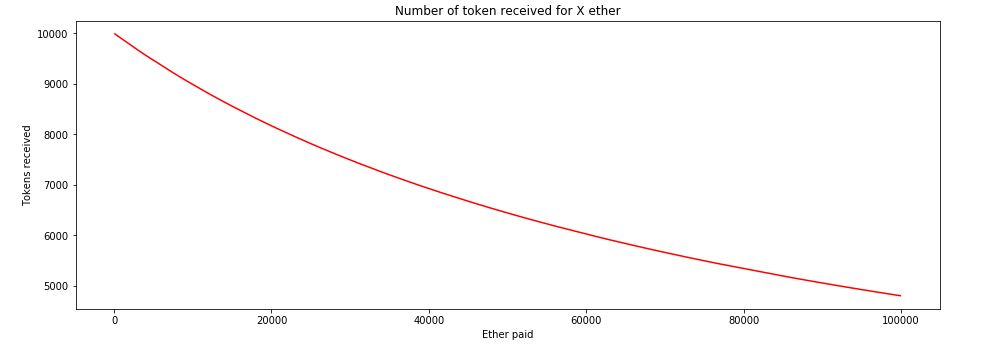 As you can see, the price is initially cheap, returning 100 Tokens per ether, and then the return gradually eases down towards nothing.